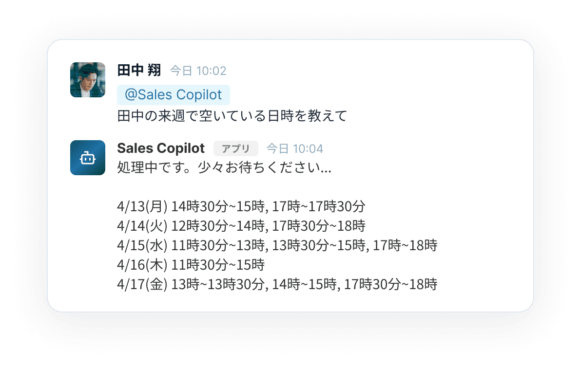 - 空き時間を自動判定し、テキスト形式で日程候補を生成・送信