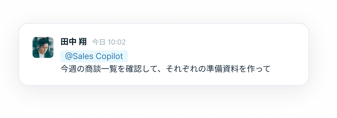 過去の議事録・メール・Slackのやり取りを自動で参照し、コンテキストを踏まえた準備が可能です。