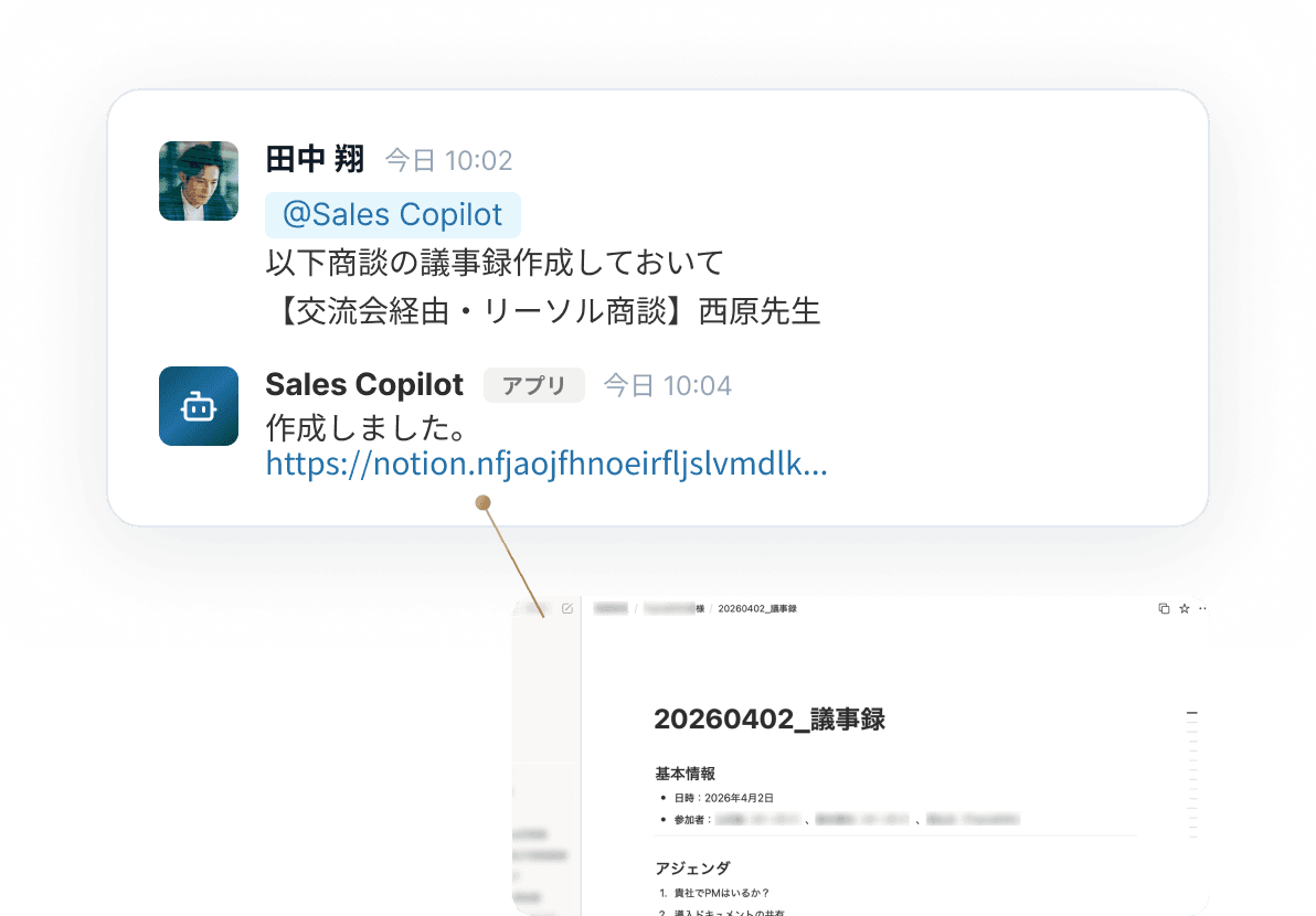 商談の録音・文字起こし、またはSlackへの情報入力をもとに生成。