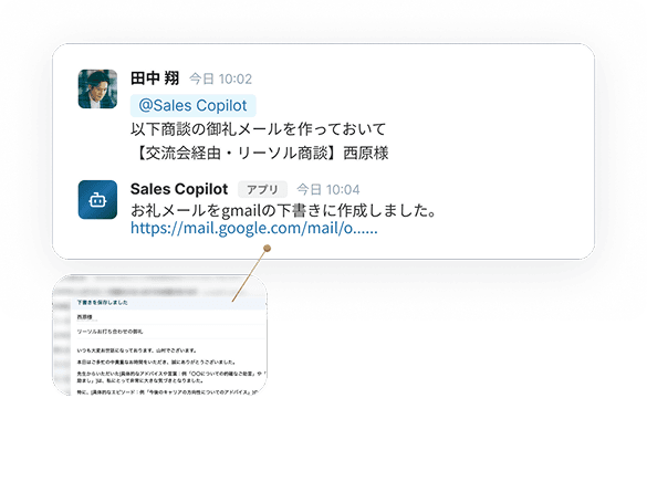 商談直後に、商談内容を踏まえたお礼メールの下書きを自動生成します。
