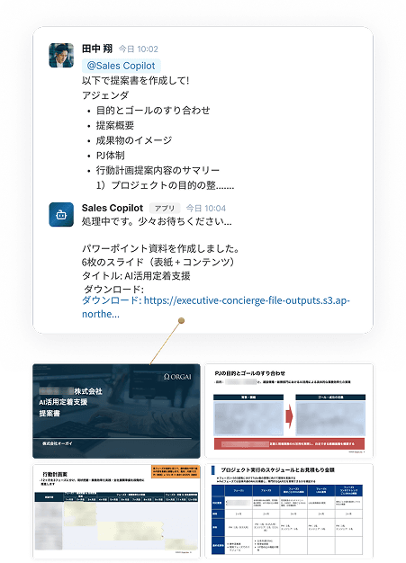 商談議事録・相手の課題情報をインプットに、提案資料を自動で生成します。
